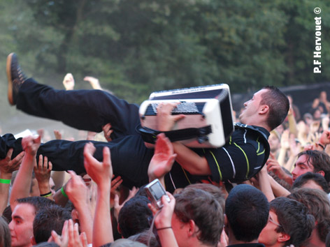 – Mass Hysteria débarque ! Du son, du gros son ! Je crois pas qu’il soit utile de rappeler leur réputation scénique, elle les devance et encore une fois ils le prouvent ! Et de nombreux « fous » s’en vont une nouvelle fois sauter sur scène ! (Mais, ces « fous » on les aime !)