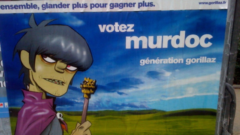 Ces affiches représentent Murdoc, leader virtuel du groupe Gorillaz, dans la même posture qu’un certain Nicolas Sarkozy lors de la campagne présidentielle de 2007. Un slogan: « Ensemble, glandez plus pour gagner plus. »