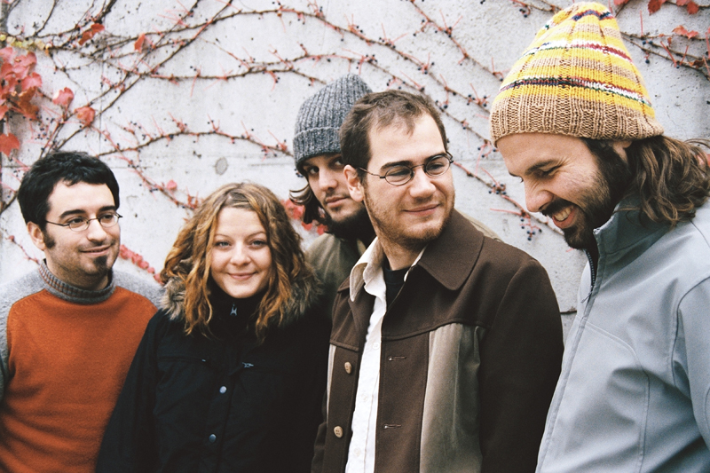Les Cowboys Fringants à leurs débuts : Jean-François, Marie-Annick, Karl, Jérome, Domlebo.