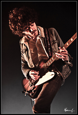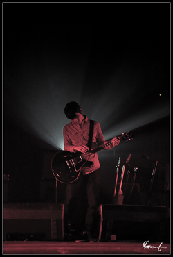 Poussé par le public, Saez est à bloc, tout comme ses musiciens. Cédric Le Roux est encore plus Rock’n’Roll que les deux jours précédents, Thomas Coeuriot arrive à s’impose vis-à-vis de Damien et Cédric. Étant mieux placé pour voir le batteur, je peux enfin apprécier pleinement le jeu de batterie de Goeff Dugmore. Même Franck si discret d’habitude « bouge »un peu plus et Patrick West a l’air de bien prendre son pied. Quand au petit Damien, entre exciter le public qui n’en demande pas tant pour bouger, s’amuser avec ses deux guitaristes et se rouler par terre, il n’arrête pas une seconde. On sent vraiment qu’il est heureux d’être là au milieu de ces fous.