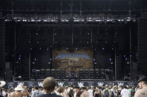 Quittons le chapiteau, et approchons de la grande scène, celle où sont les têtes d’affiche, imposante, en bas de la butte, ce qu’on se sent petit, quand Mika fait apparaitre une énorme marionnette ou que le chanteur d’Airbourne se décide à grimper au poteau de celle-ci, alors que son groupe venait d’arriver sur le thème de Terminator 2 (oui rien que ça). Cette scène que Jay-z a littéralement maitrisé, tant visuellement, que musicalement. Ce type est sobre, efficace, et il envoie.