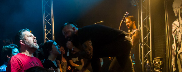 Dès le premier titre, AqME commence fort avec Avant le jour, ils sont à fond et c’est la folie dans la salle. Le public sort ses plus beaux pas de danse et les pogos et autres circle pits sont de la partie. Vincent ne tient pas en place. Il harangue un public qui n’en demandait pas tant pour se lâcher totalement et reprendre en chœur les titres. Sur Au-delà de l’ombre, le groupe demande au public de filmer afin de réaliser un clip pour le morceau. Vincent aime aller au contact de son public et notamment sur Le rouge et le noir qu’il chante dans la fosse. Il n’y a pas que Vincent qui fait le spectacle, les deux Julien ne sont pas en reste et ça vanne dans tous les sens sur scène. Le concert finit en apothéose sur Macabre moderne. Comme toujours AqME a enflammé la salle et nous a fait passer une super soirée !