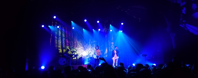 On a à peine le temps de faire petite pause pendant le changement de plateau avant que ne retentissent les notes de I’m So Excited interprété par Le Tigre. Le morceau est balancé en ouverture de set et met le feu dans la salle avant que Tegan et Sara n’apparaissent pour Back In Your Head. Tegan porte sa veste blanche à pois noirs et Sara son perfecto en cuir, toutes les deux arborent jeans et baskets blanches. Suivent I Couldn’t Be Your Friend et How Come You Don’t Want Me. Elles échangent quelques mots teintés d’humour avec la salle. Tegan avoue d’emblée que « Ok, bon » sont les deux seuls mots qu’elle connait en français. On se sent vite en famille avec Tegan and Sara. Cette tournée est aussi l’occasion de fêter les 10 ans de la sortie de leur album emblématique The Con. La musique reprend et l’ambiance monte d’un cran avec Drove Me Wild, suivi de l’excellent Goodbye, Goodbye. La première chanson de Love You To Death (LY2D) sera Faint of Heart suivie de White Knuckles. On retrouve dans chaque morceau l’émotion qui fait le succès du groupe. Les nouvelles orchestrations mettent les chansons en valeur et donnent un sacré dynamisme à la prestation. Tegan introduit I Was a Fool en demandant si quelqu’un a vécu une rupture récemment. S’ensuit un dialogue avec l’un des spectateurs qui est séparé depuis deux semaines. En face de lui, les filles sont impressionnantes de gentillesse : »Two weeks ! Are you OK ?« . Ce n’est qu’un bref exemple des petits moments d’intimité que le groupe sait créer avec son public, et du souci constant de communion avec des fans qui leur rendent bien.