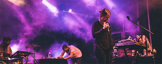 Deuxième petite sensation de la soirée, ma préférée : C’H. Alors pour les non-habitués de la graphie bretonne les lettres C et H séparées par une apostrophe se retrouvent le plus souvent à la fin des mots et se prononcent « RRR ». Vous l’aurez donc compris, le groupe C’H est un groupe d’origine bretonne (c’est surtout la rencontre entre le groupe Chapi Chapo Orchestra et Tiny Feet) mais qui chante en anglais et parfois, quand même, en breton. Mais là où ça devient intéressant c’est leur manière de procéder car, comme vous pouvez le voir sur les photos, ils apportent avec eux sur scène bon nombre de jouets pour enfants et d’accessoires vintage dirons-nous. Ces accessoires (clavier en plastique, boite à musique, jouets en plastique qui font pouët) sont souvent utilisés en début de morceau, le son est enregistré, déformé, travaillé pour service de base au morceau. C’est assez drôle de voir ces grands enfants faire de la musique avec des jouets, souvent vétustes, et réussir à composer un morceau plein d’énergie et de rock. Car, même si le chanteur est une chanteuse, et que les instruments sont des jouets, ça envoie du pâté (breton).