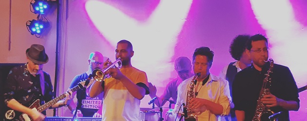 Sur scène ce ne sont pas moins de neuf musiciens accompagnés ce soir par un chanteur éthiopien solaire, qui investissent la petite scène de La Lingerie. On a Matt au trombone, Yann à la trompette, Val au sax ténor, Cédric au sax alto, François aux claviers, Killou à la guitare, Manu à la basse, Fred aux percussions et Jeff à la batterie. C’est Georges qui assure le chant ce soir, et nous emporte, avec sa voix, aux confins du continent africain. Le set commence sur des notes très cools, avec des tonalités jazz assez douces et planantes. Le public ondule doucement. Le chanteur est assez détendu et arrive sur scène un peu en retard au son des appels du public. Le rythme s’accélère au fil des morceaux et le groove prend de l’ampleur. La guitare envoie un son profond avec des distorsions proches du larsen sans jamais y basculer. Les effets sont psychés à souhait et emmènent l’esprit ailleurs.