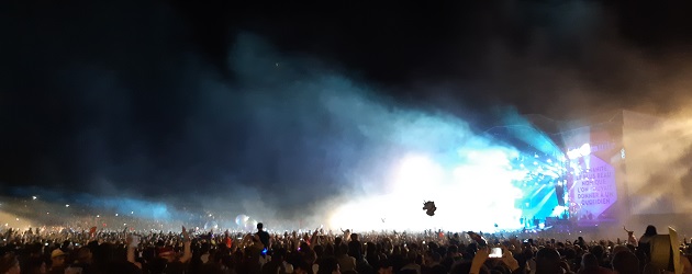 On passe devant la P’tite Scène pour remonter vers la Grande et l’on se retrouve happé par le set de Los Tres Puntos qui envoie un ska survolté. On n’arrive plus à compter le nombre de cuivres présents sur scène qui peine à contenir toute cette énergie. On retrouve les slogans habituels tels que « Pueblo Unido » et ces mélodies pleines de groove qui font toujours plaisir.