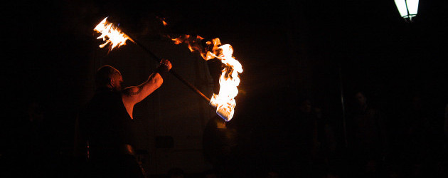 Avant de repartir, nous jetons un coup d’œil aux cracheurs de feu et aux danseuses, qui sont en représentation sur les pavés de la ferme, réchauffant l’atmosphère tandis que le soleil est tombé à Noisiel.